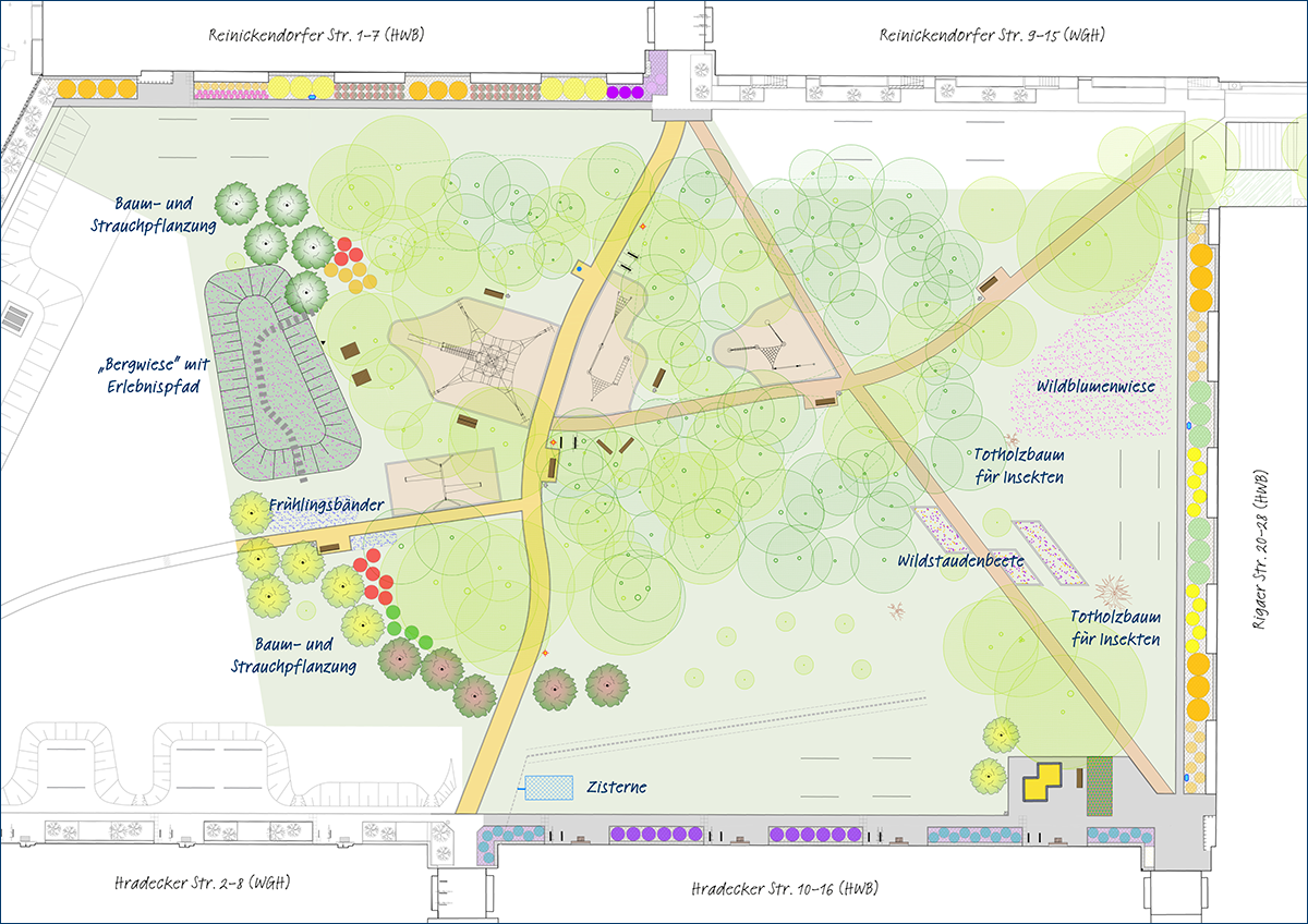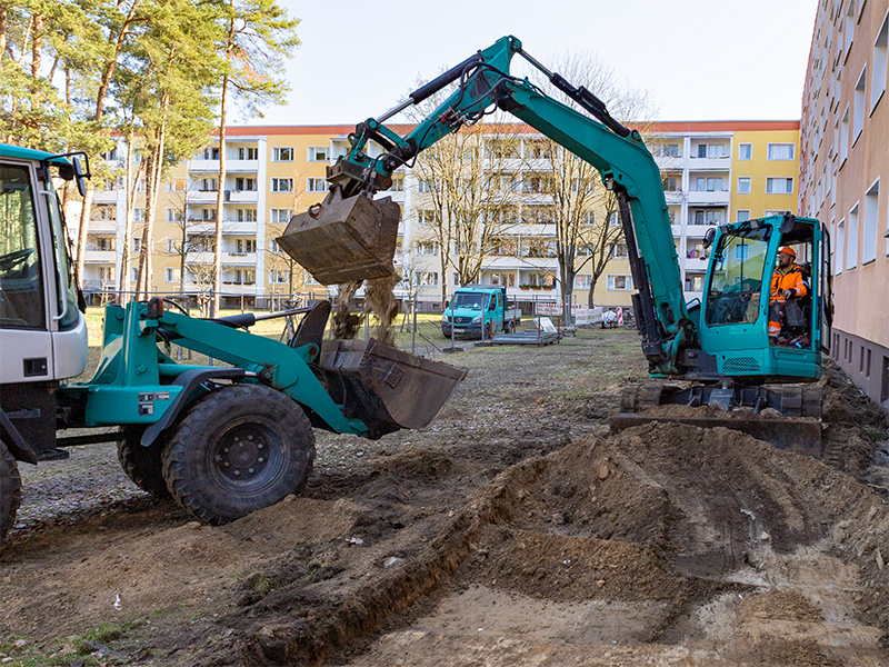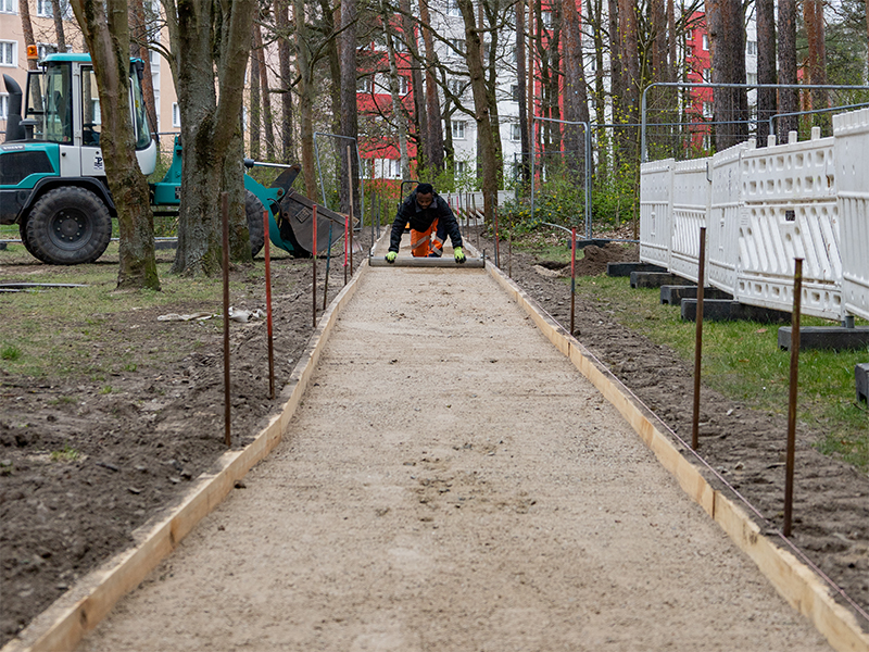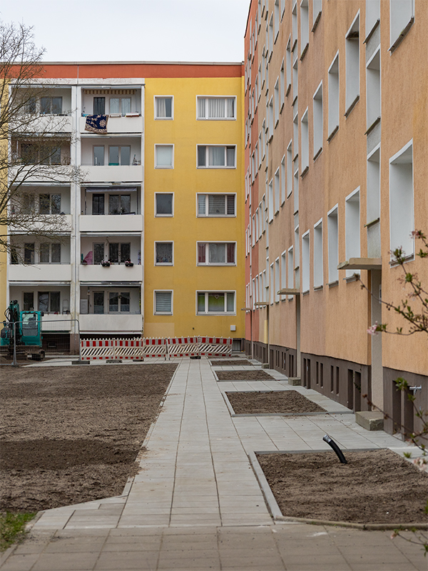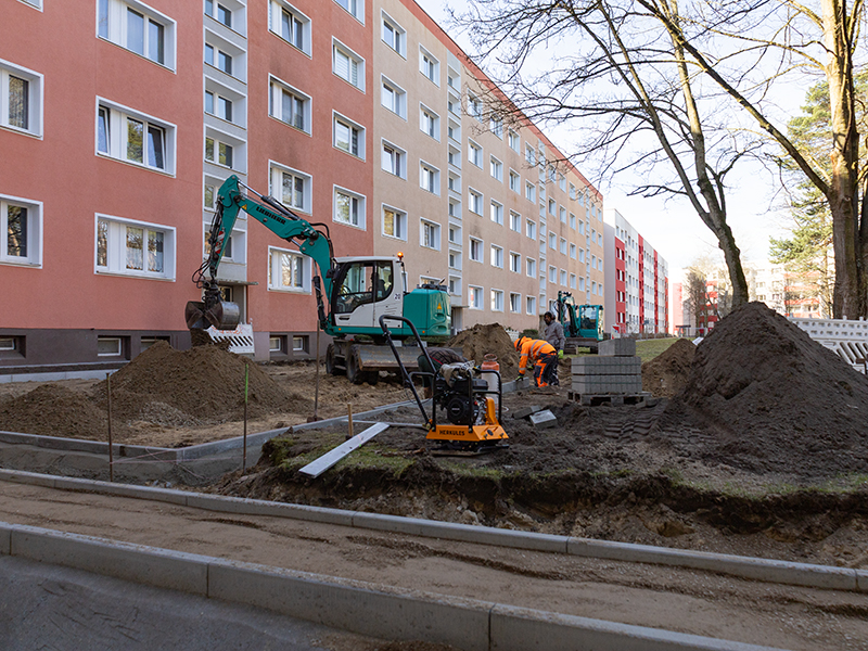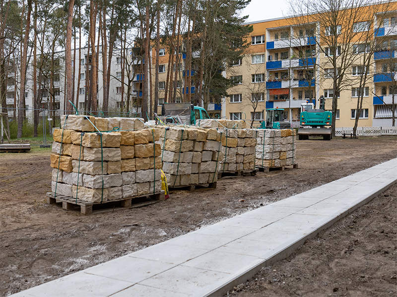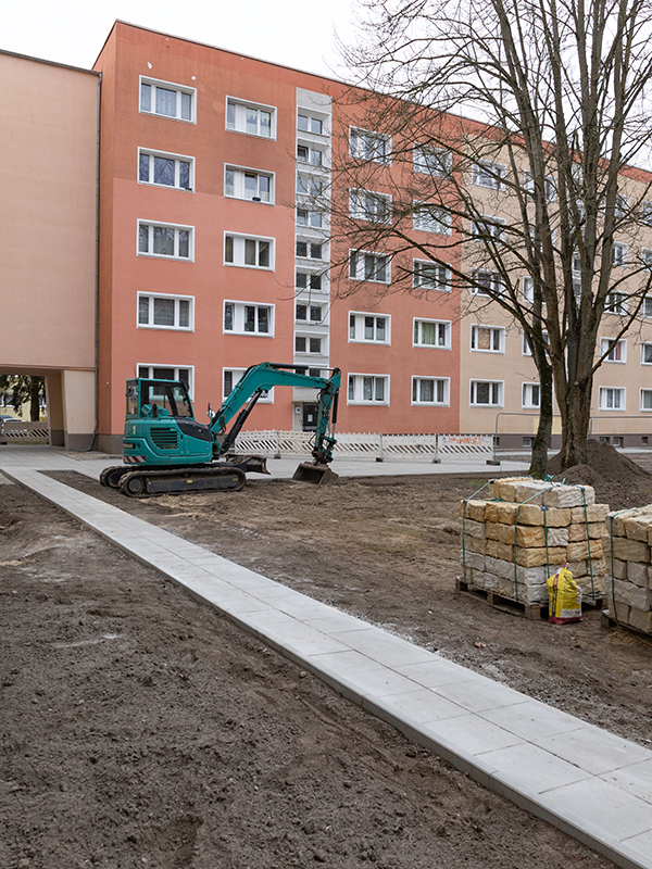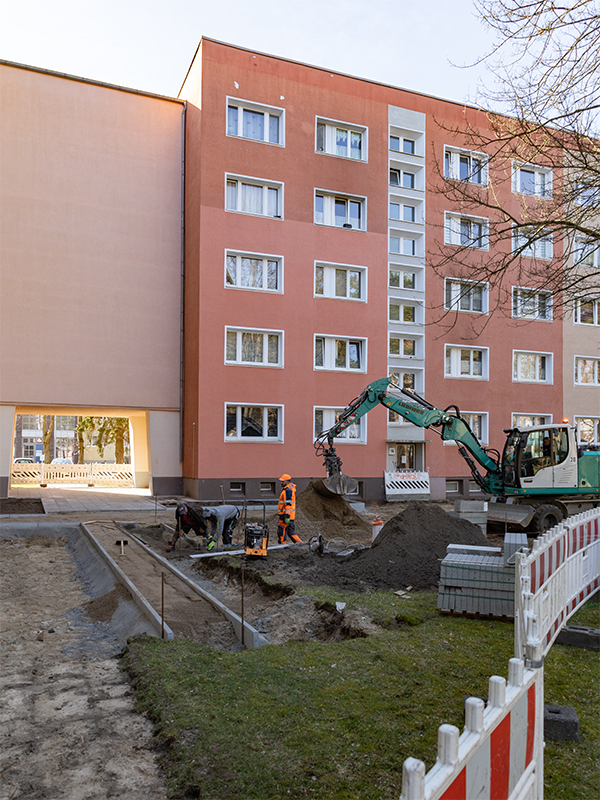 16. April 2026 // Die Um- und Neugestaltung des Hofes zwischen Reinickendorfer, Rigaer und Hradecker Straße nimmt Kontur an. Als Anfang März der Boden nach der ungewöhnlich langen Frostperiode wieder aufgetaut war, konnte die von der HWB beauftragte Oranienburger Baufirma endlich loslegen. Ein Anfang ist gemacht: Die ersten komplett neu angelegten Gehwege sind gepflastert und die Kellerabgänge des Wohnblocks Rigaer Straße wurden wie geplant bereits abgerissen und deren Türöffnungen sind zugemauert. Anstelle der Abgänge werden später neue Rabatten mit heimischen Sträuchern und Bodendeckern angelegt.